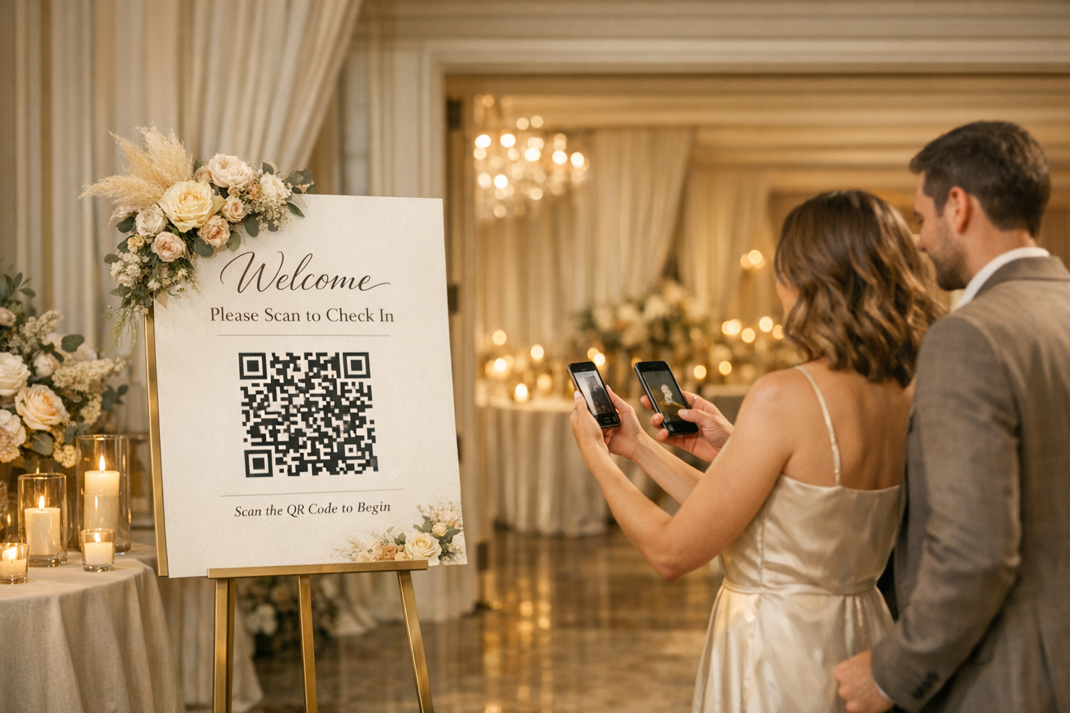 The same QR works on welcome signs, QR cards, table cards, and printables so guests do not need extra instructions.